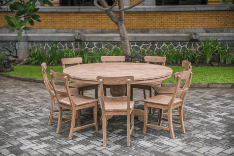 Bijna uitverkocht (1 op voorraad)€ 2.250Eenheid prijs /Niet beschikbaarRonde teak tuintafel 140 + 5 Betawi Gelung stoelen
