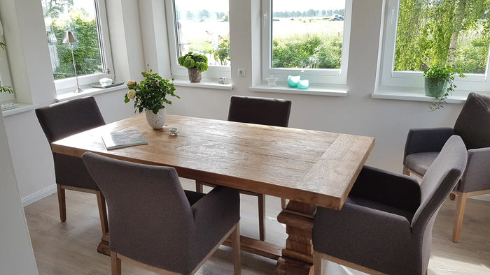 Onze kloostertafel van Souren Meubels is meer dan alleen een tafel; Het is een centraal punt in ons huis. Het oude teakhout straalt geschiedenis, kracht en een ongelooflijke sfeer uit. Als we bezoek krijgen, wil iedereen gewoon aan de kloostertafel zitten.