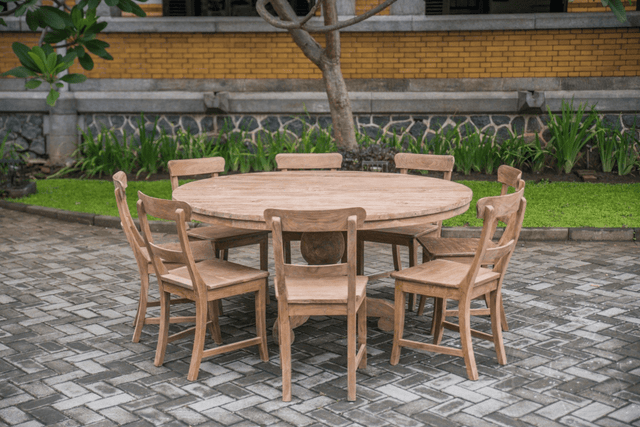 Ronde teak tafel 160 oud hout + 8 stoelen is niet op voorraad. Reserveer nu en betaal pas bij levering (PIN)