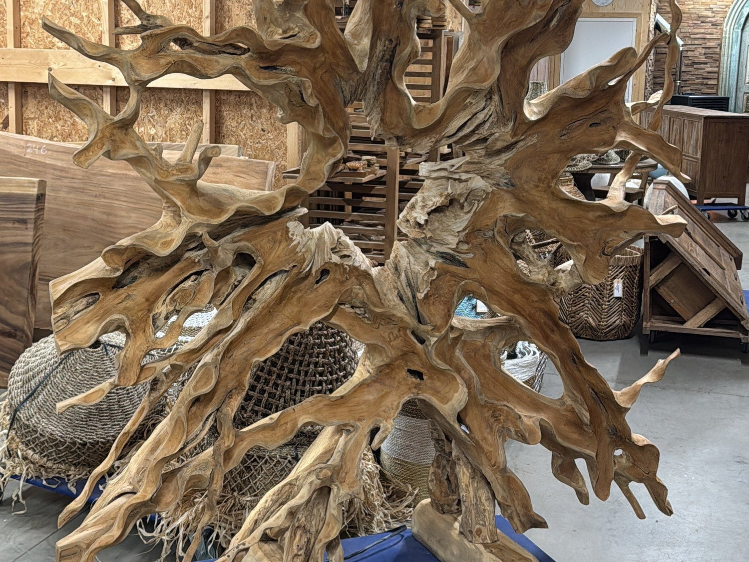 Breng een krachtig natuurstatement in uw interieur. Deze grote roomdivider van massieve teakwortel (ca. 180×200 cm) is handgemaakt en volledig uniek. De organische vormen zijn puur natuur en maken elk stuk onvergelijkbaar.