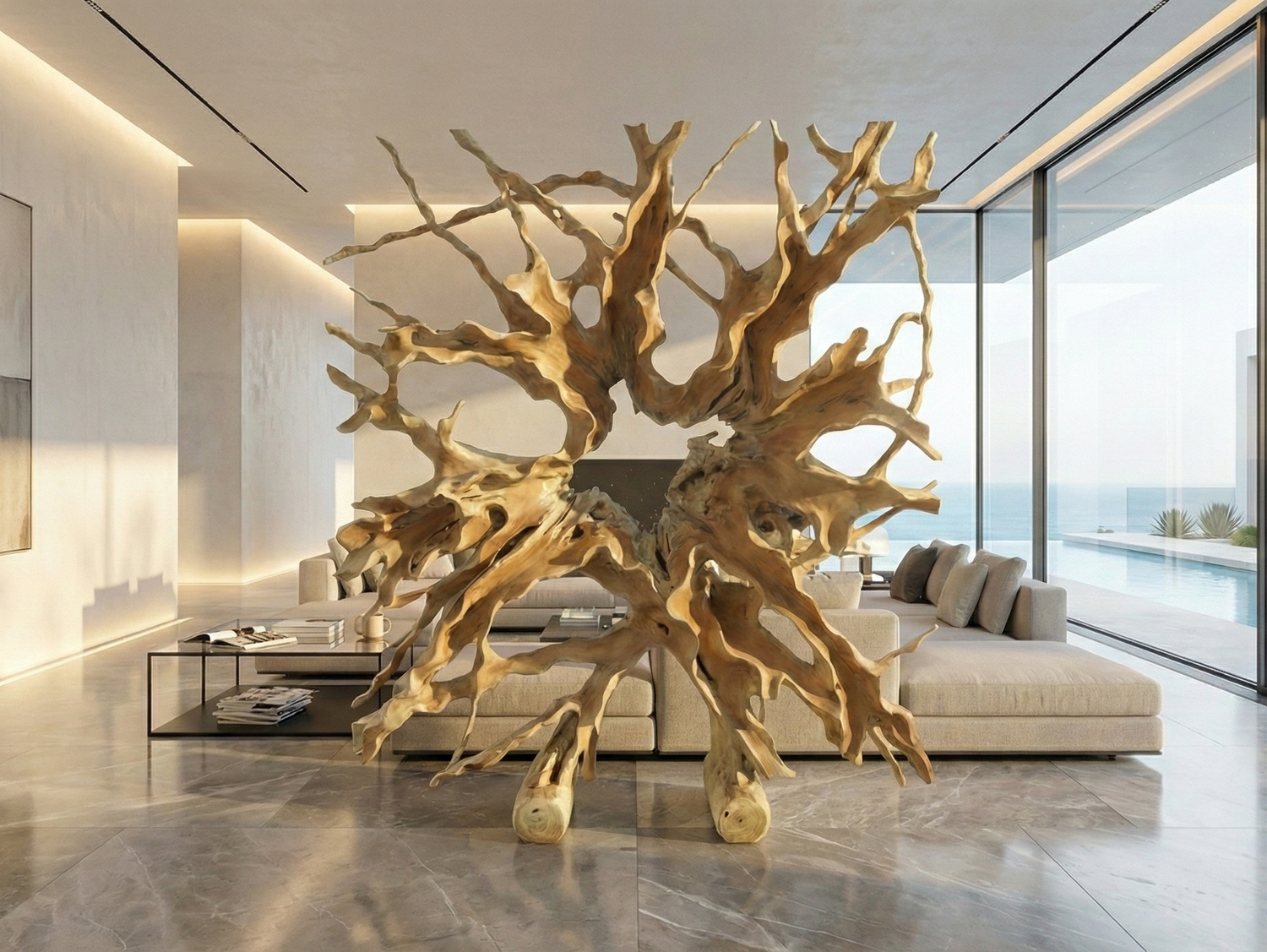 Door zorgvuldige selectie en ambachtelijke afwerking ontstaat een indrukwekkend houten sculptuur met verfijnde vertakkingen, warme tinten en een levendige dieptewerking.