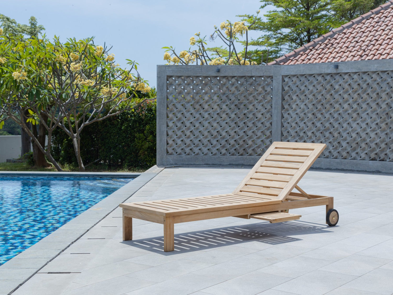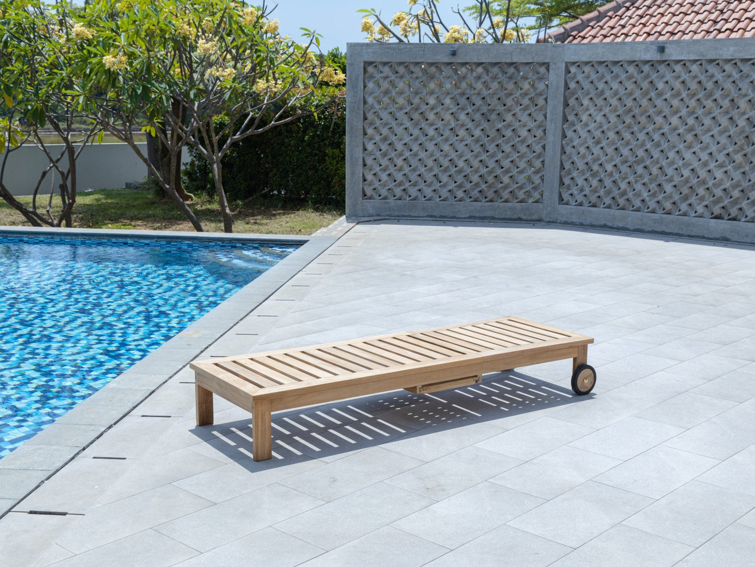 Teak ligstoel met wielen en zijtafeltje – Massief teak